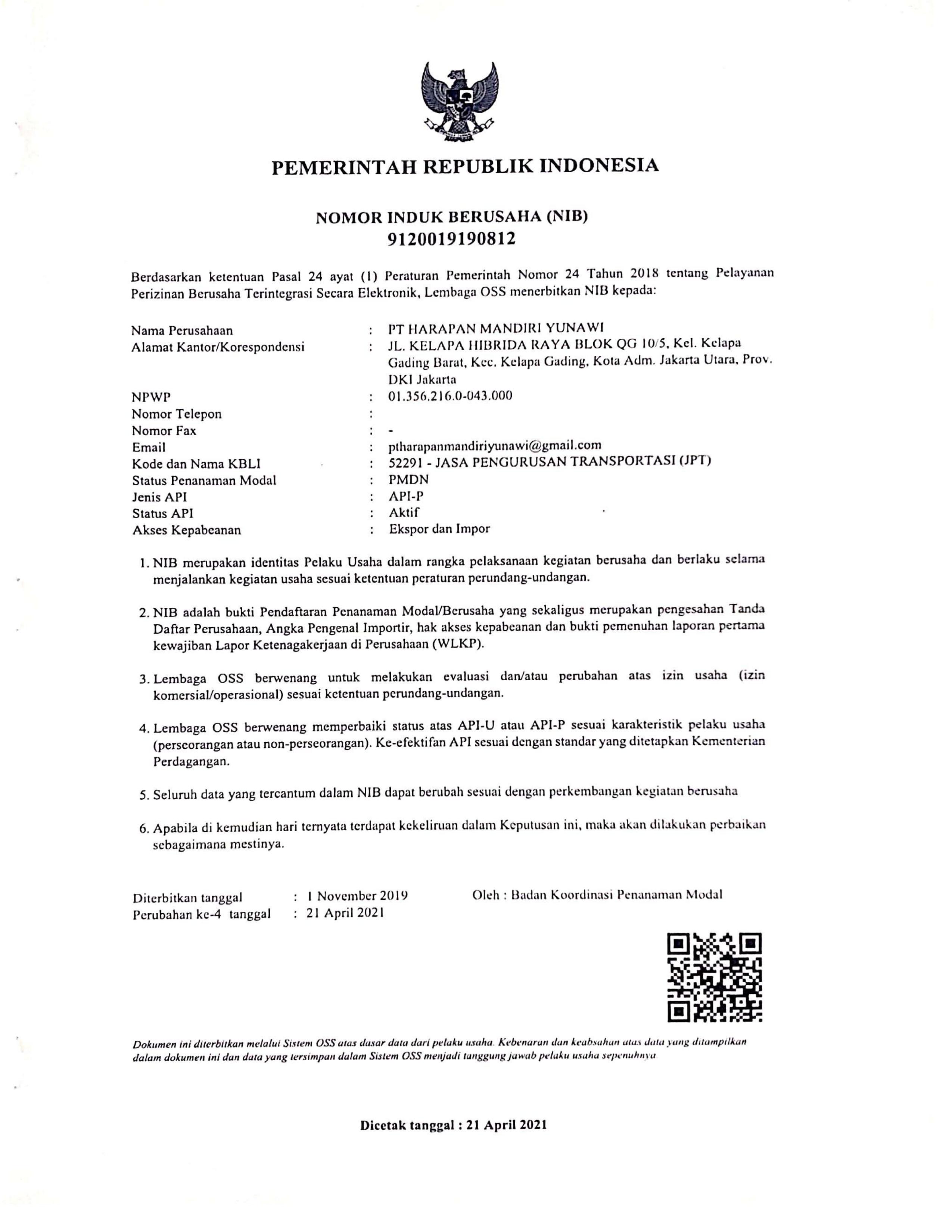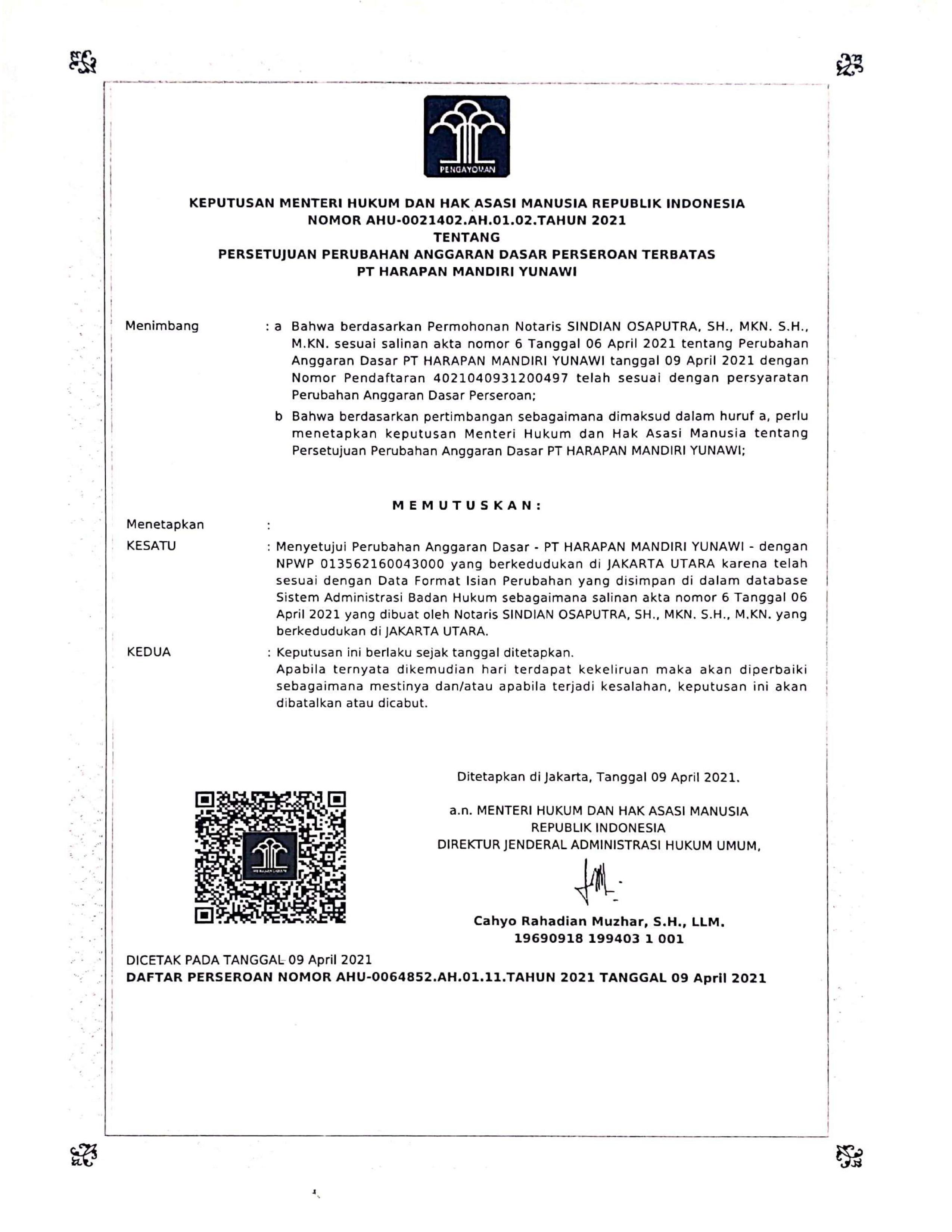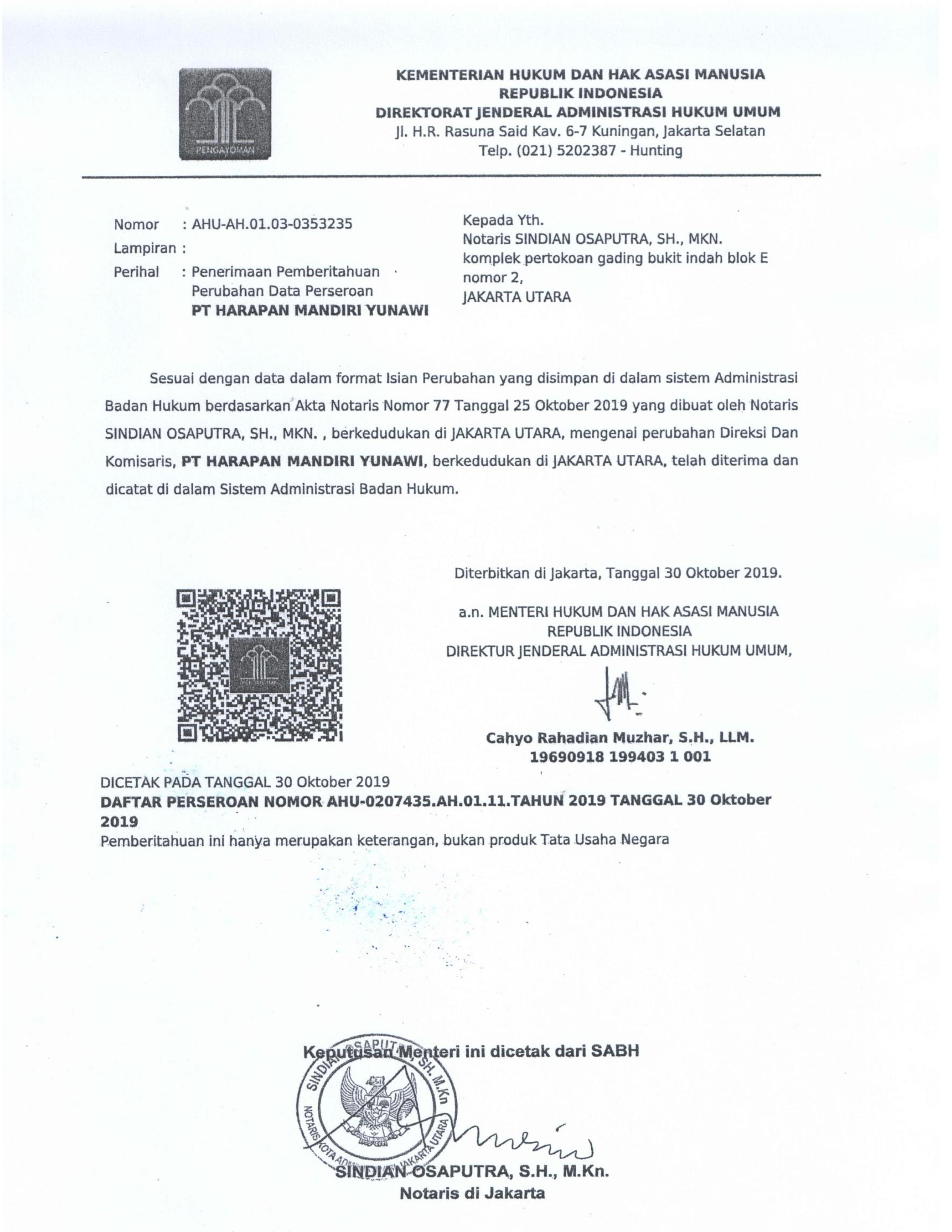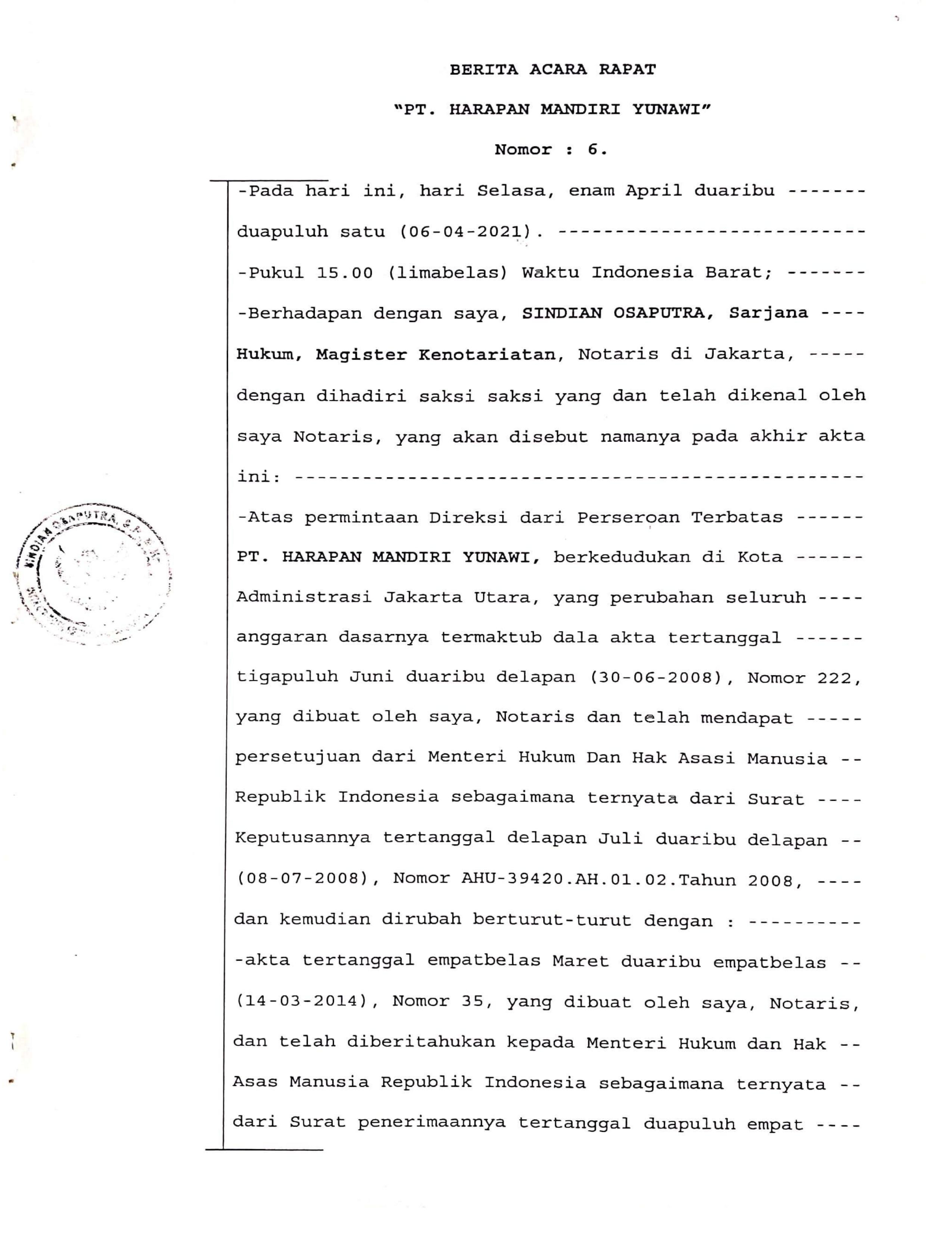 Legalitas PT. Harapan Mandiri Yunawi