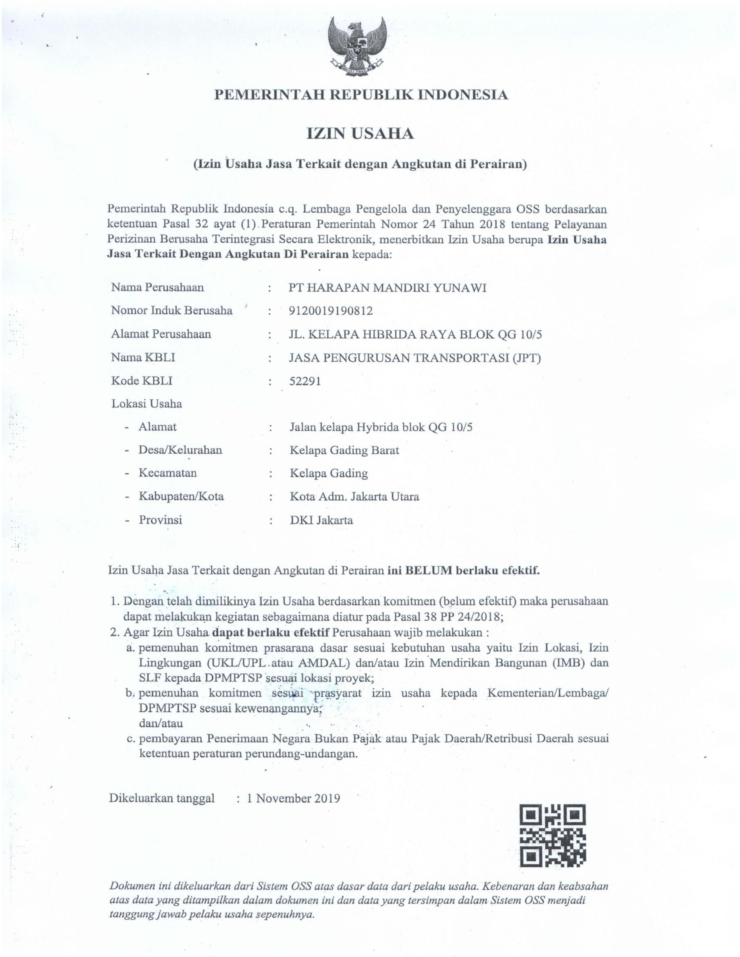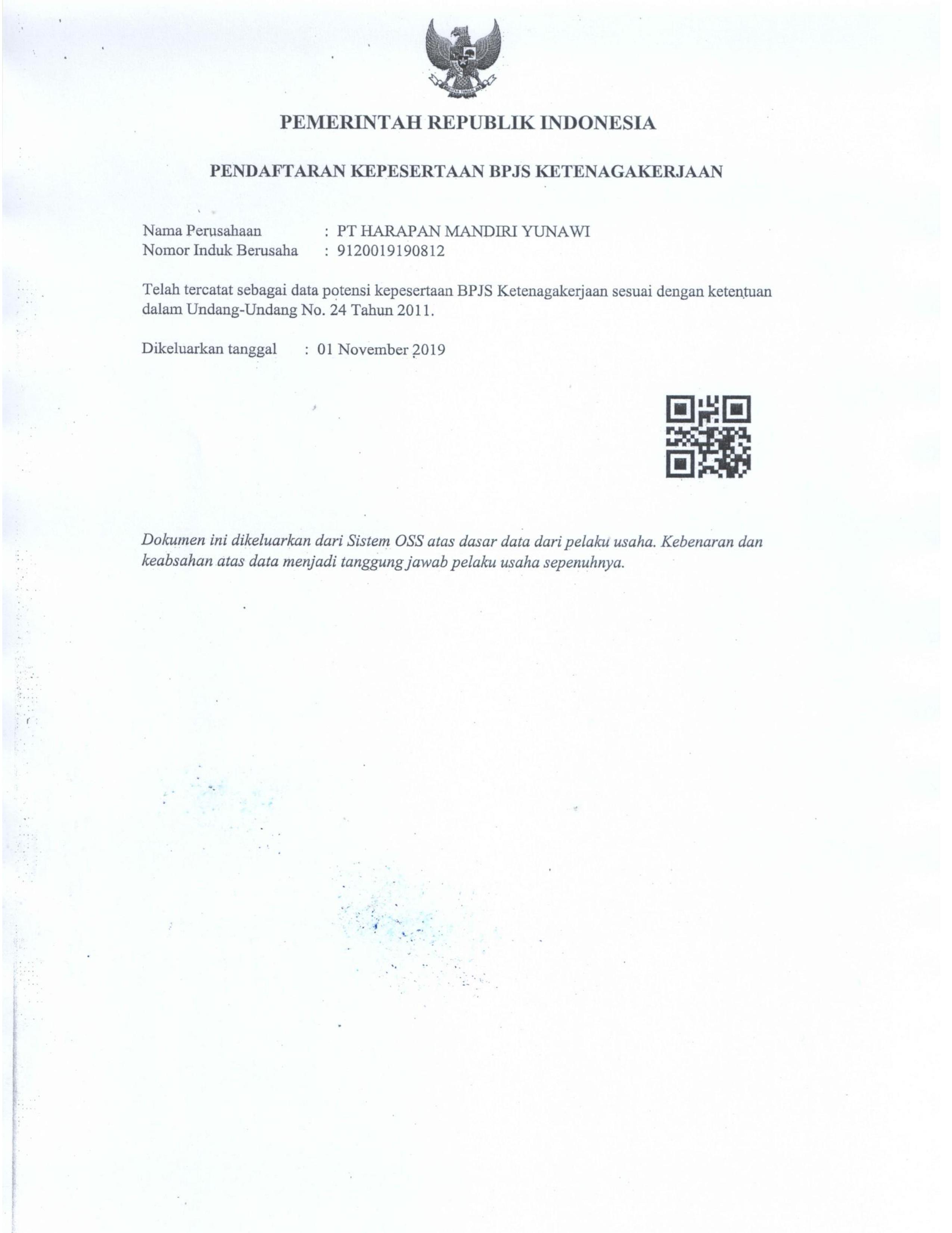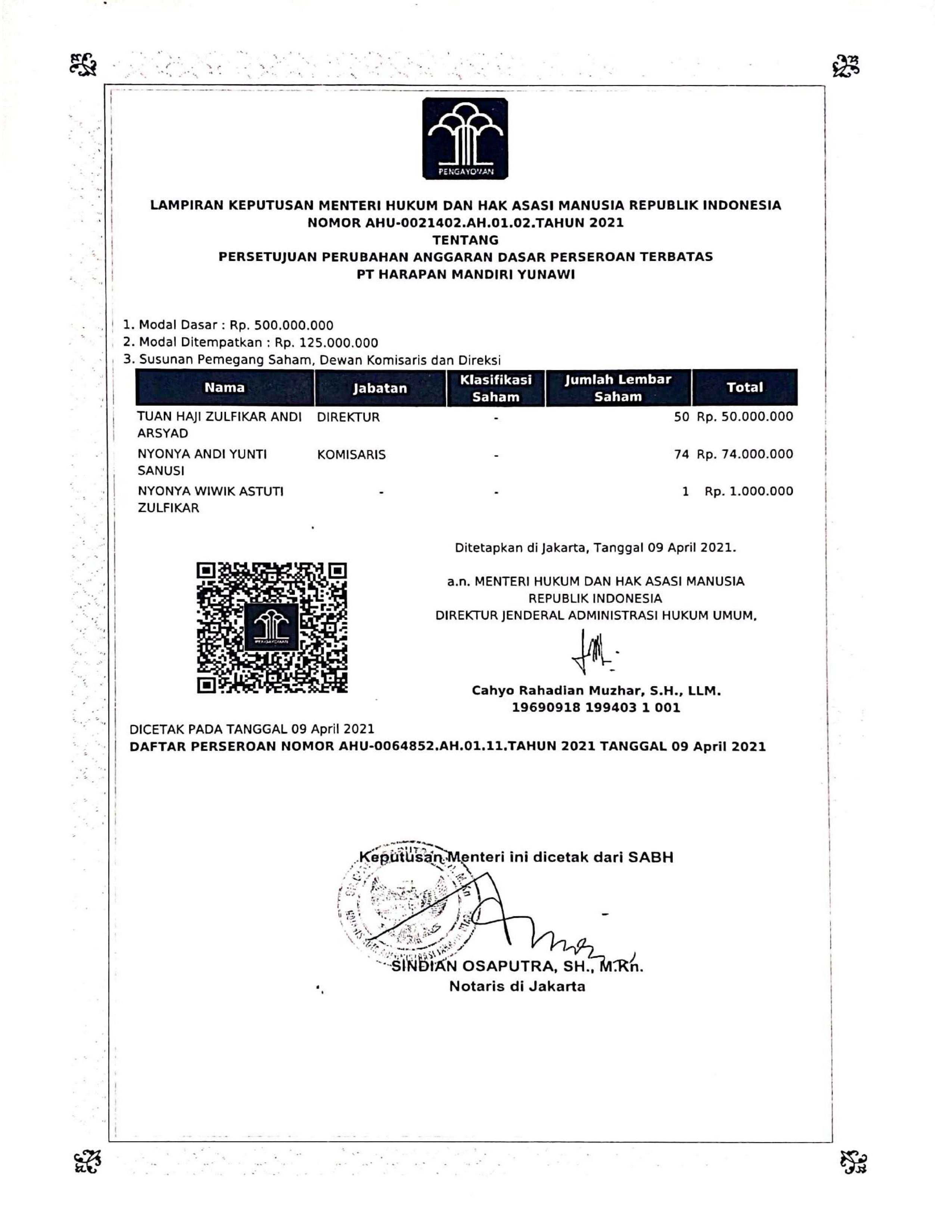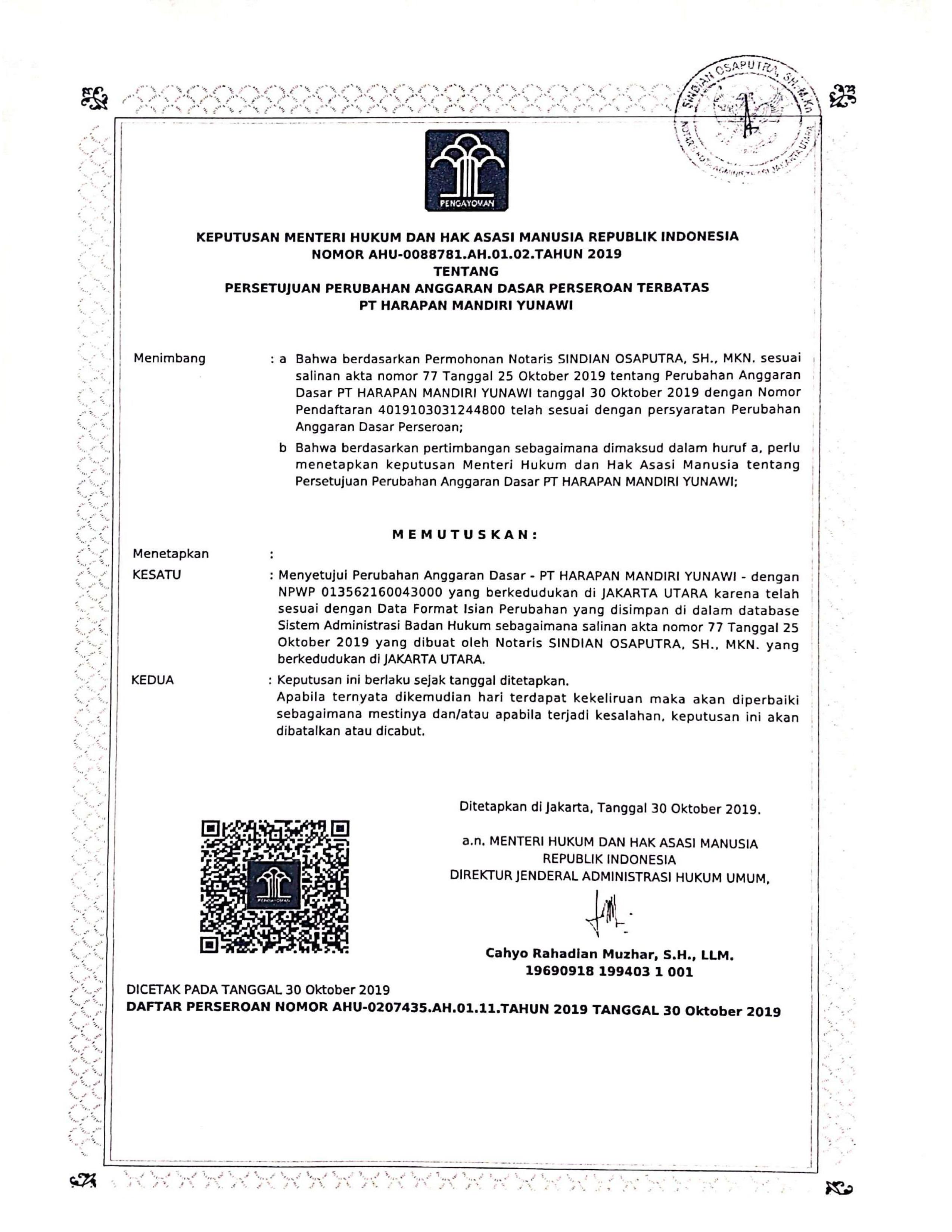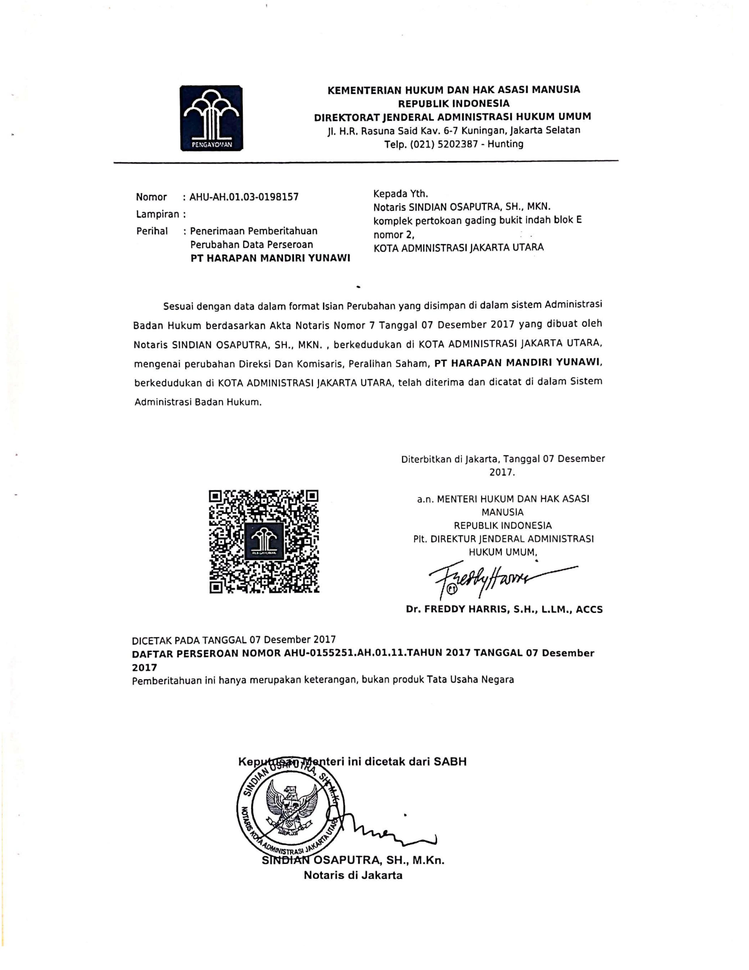 Legalitas PT. Harapan Mandiri Yunawi